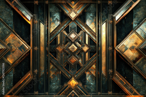Intricate geometric design with dark and gold metallic textures, creating a luxurious and steampunk aesthetic.