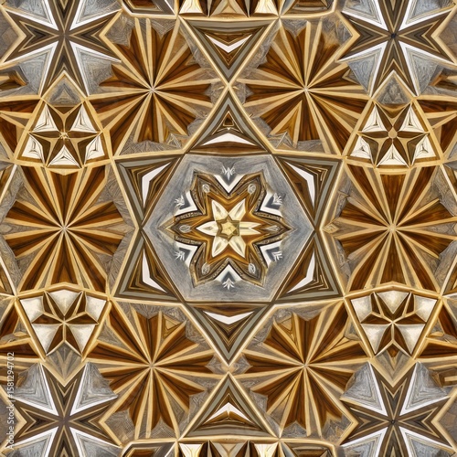 Intricate geometric pattern featuring star shapes in shades of gold, brown, and gray, creating a visually stunning and harmonious design for artistic backgrounds or textiles