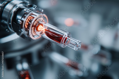 Intricate Glass Vial Laboratory: The detailed, glowing apparatus showcases a meticulously crafted glass vial, filled with a vibrant red liquid.