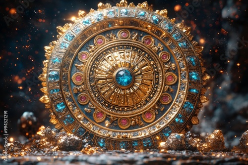 Intricate gold and blue jeweled ornament, a luxurious decorative artifact shining brightly