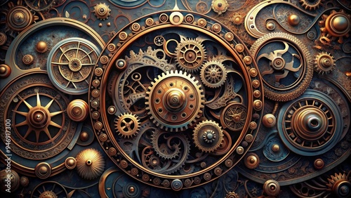 Intricate hand-drawn steampunk design features gears, clockwork mechanisms, and ornate filigree, blending Victorian elegance with industrial sci-fi elements in a rich, muted color palette.