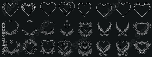 Intricate heart designs on a black background, perfect for love themed graphics, tattoos, or jewelry designs. Detailed white outlines create a striking contrast, showcasing artistry and creativity