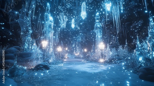 Intricate Ice Sculpture Festival with Shimmering Frozen Statues, Illuminated by Colorful Lights in a Magical Winter Wonderland at Night