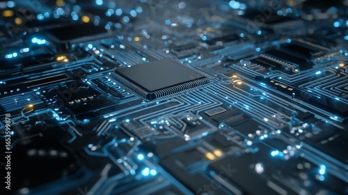 Intricate illuminated circuit board showcasing advanced microchip technology and digital connectivity, symbolizing innovation.