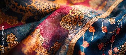 Intricate Indonesian Batik Fabric with Golden Floral Motifs and Rich Colors