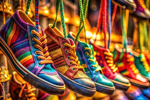 Intricate macro captures of hanging shoes: detailed laces, textures, and hardware.