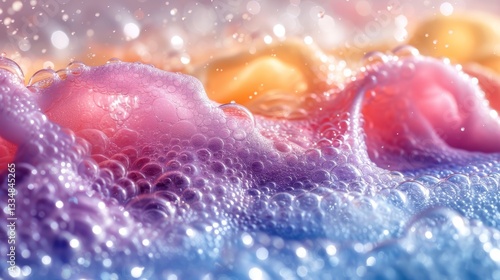 Intricate Macro View of Iridescent Bubbles Flowing with Dreamy Pink, Orange and Blue Hues and Sparkling Bokeh Lights