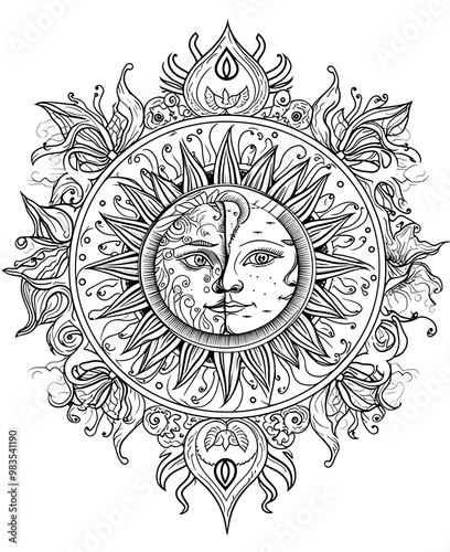 Intricate Mandala Featuring Sun and Moon Line Art Design