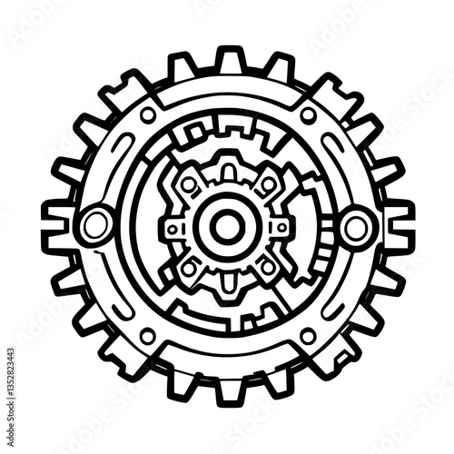 Intricate mechanical gear design showcasing interlocking cogs and a crisp outline on a white background