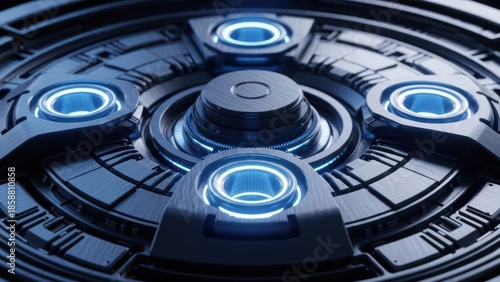 Intricate metallic circular mechanism with glowing blue energy conduits
