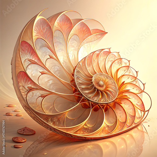 Intricate nautilus shell spiral pattern abstract light golden shimmering texture design illustration