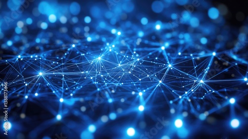 Intricate network of glowing blue lines and dots creates a mesmerizing digital landscape, illustrating the complexity and beauty of connectivity in a modern technological environment