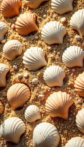 Intricate patterns of seashells against a golden sandy backdrop, sand, patterns