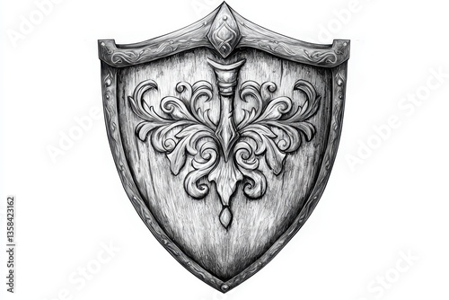 Intricate Pencil Sketch of a Medieval Knight's Shield Designed for a Colo Book Page with Ornate Symmetrical Patterns