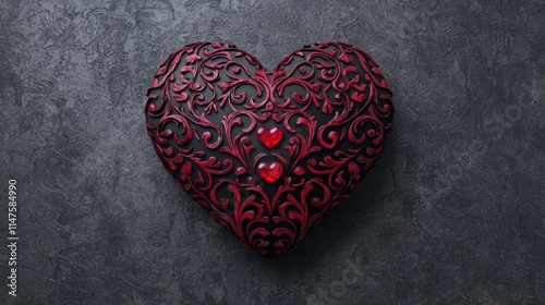 Intricate Red Heart Design with Decorative Swirls and Gems