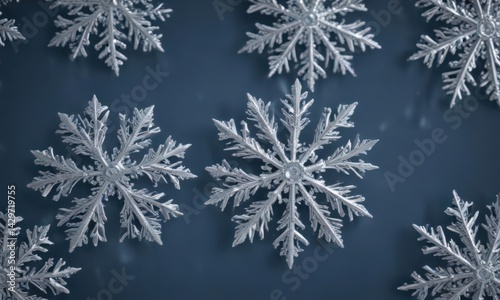 Intricate silver snowflakes on a blue background Ideal for winter themed projects , decorative, illustration, holiday