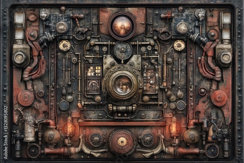 Intricate steampunk device with various metal components and illuminated features