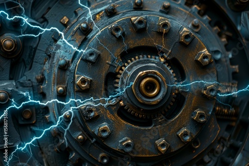 Intricate steampunk machine with exposed gears receiving electrical currents