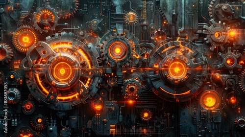 Intricate steampunk machinery with glowing orange gears and cogs, showcasing industrial revolution technology in a futuristic design.