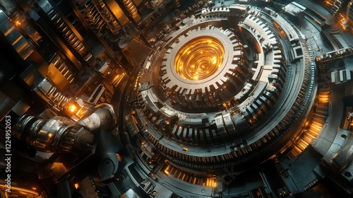 Intricate steampunk-style machine, glowing gears and metallic structures. Perfect for sci-fi, technology, or industrial designs, evokes power and complexity.