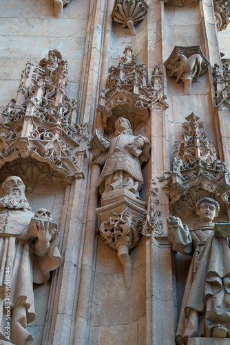 Intricate stone carvings of Salamanca Cathedral showcasing historical figures and architectural details in Spain's rich heritage