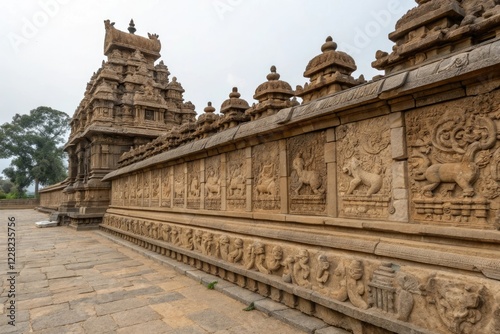 Intricate stone carvings on an ancient wall depicting mystical creatures, mysterious, art, architecture, mystic, stone carving
