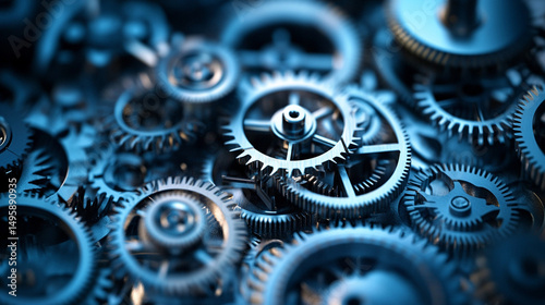 Intricate system of interconnected blue gears