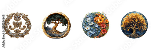 Intricate tree and floral artistic decor elements set isolated on transparent background