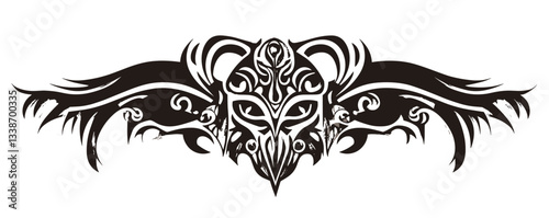 Intricate tribal tattoo design with symmetrical abstract shapes and wing-like patterns.