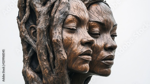 Intricate wooden sculpture of two serene faces intertwined with tree roots in a minimalist setting