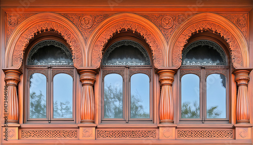 Intricate wooden window frames with arched tops and carved detailing, showcasing Moorish architectural style