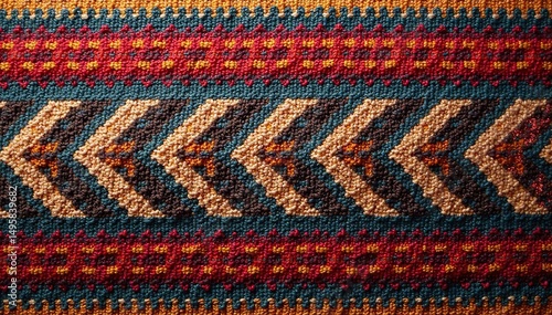 Intricate woven textile with bold zigzag and floral elements, pattern, art