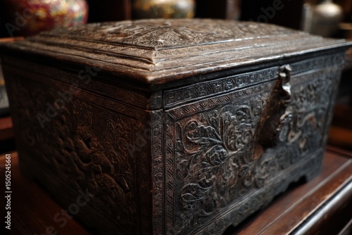 Intricately carved antique wooden box displayed in a vintage museum setting during the daytime