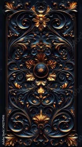 intricately carved ornate panel with swirling floral and leaf patterns in gold on a dark background, elegant and decorative with a luxurious feel