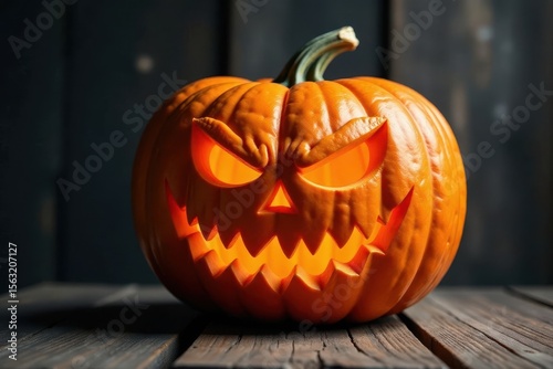 Intricately carved pumpkin, menacing shadow, weathered wood background, celebration, wicked