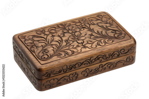 Intricately carved wooden box showcasing a beautiful floral design, perfect for storage or decorative purposes.