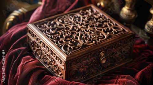 Intricately carved wooden box with floral designs, resting on a rich red velvet fabric.