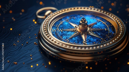 Intricately designed compass resting atop a dark, textured surface surrounded by shimmering light. Generative AI