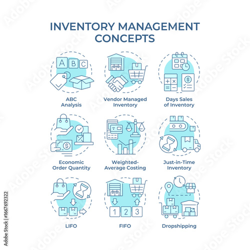 Inventory management soft blue concept icons. effective system of products distribution organization. Supplies chain. Icon pack. Vector images. Round shape illustrations for booklet. Abstract idea