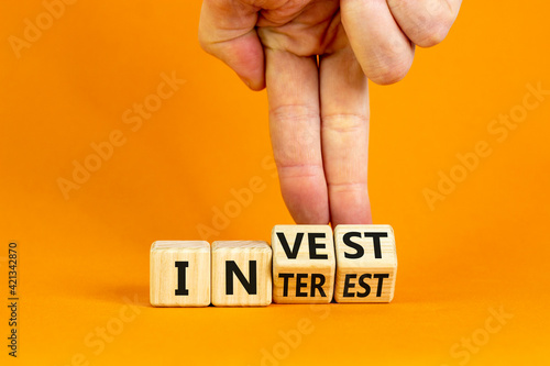 Invest or interest symbol. Businessman turns wooden cubes and changes the word 'invest' to 'interest'. Beautiful orange background, copy space. Business and invest or interest concept.