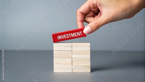 Investment Concept Illustration with Hand Placing Red Block on Structured Stack of Beige Blocks Against Gradient Background