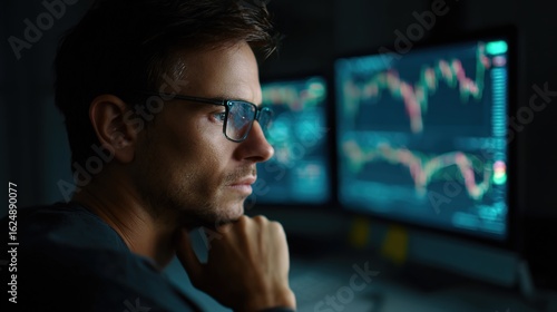 Investor Analyzing Financial Data: A focused investor, wearing glasses, thoughtfully examines financial charts on two computer monitors in a dimly lit environment.
