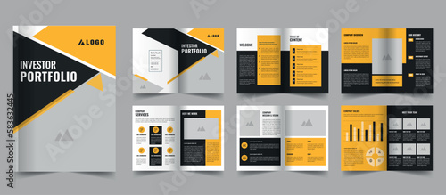 Investor portfolio template design or company profile brochure layout with yellow shape background