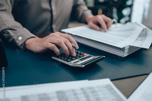 Investors working on desk office and using a calculator to calculate balance, profit, currency and cost. Accounting and Financial concept.