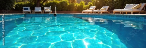 Inviting blue swimming pool shimmering under the summer sun, ready for a refreshing dip Perfect for summer vacation, relaxation, and leisure themes , tranquil, shadow, paradise