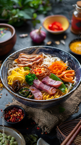 Inviting Bowl of Nutritious Udon Noodles Surrounded by Fresh Ingredients