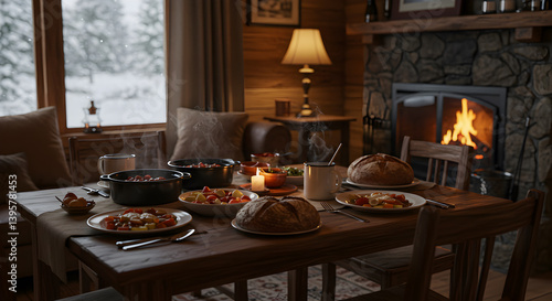 Inviting Cozy Winter Cabin Dinner Setup With Comfort Food And Rustic Decor