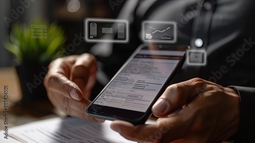 Invoice and online digital statements concept. Businessman using smartphone with invoice icons on virtual screen