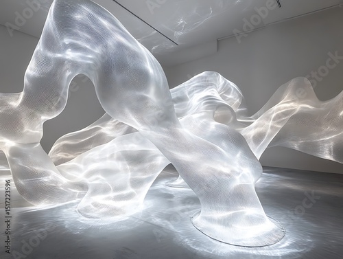 Iridescent ethereal mesh installation, creating a dreamlike atmosphere in space