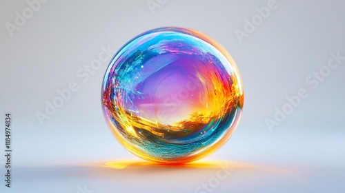 Iridescent glass sphere reflecting vibrant sunset landscape.
